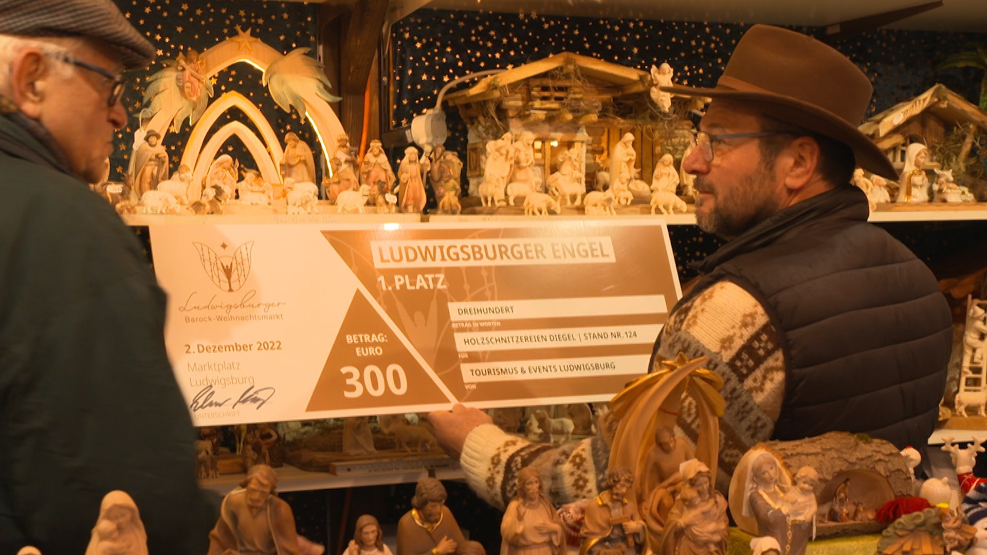 Den Weihnachtsmarkt so schön und einladend wie möglich zu gestalten – das ist in Ludwigsburg ein großes Thema. Um die Standbetreiber anzuspornen, gibt es dort auch immer einen Wettbewerb. Eine 3-köpfige Jury bewertet dabei die Stände unter anderem auf Stimmigkeit bei der Gestaltung und Themenwahl. Heute wurden vor Ort die drei schönsten Stände ausgezeichnet. Dabei wurde Harry Diegel zum Gewinner gekürt. Er betreibt einen Stand für Holzschnitzereien. Für seinen ersten Platz gibt’s einen Scheck über satte 300 Euro. Aber nicht nur Harry hat Grund zur Freude. Auch Claudia Klotz ist mit ihrem zweiten Platz beim Wettbewerb zufrieden. Sie verkauft auf dem Weihnachtsmarkt vor allem südtirolische Spezialitäten. Ihr ist bei der Gestaltung Natürlichkeit wichtig. Auf eine stimmige Außendarstellung legt auch die Drittplatzierte Simone Fröhlich wert. Sie zieht Besucher mit ihrem filigran-originellen Kunsthandwerk an. Eine einmalige Sache soll der Wettbewerbssieg für Harry nicht sein. Der Gewinner möchte auch nächstes Jahr mit seinem Stand wieder vor Ort sein – und seinen Titel verteidigen.