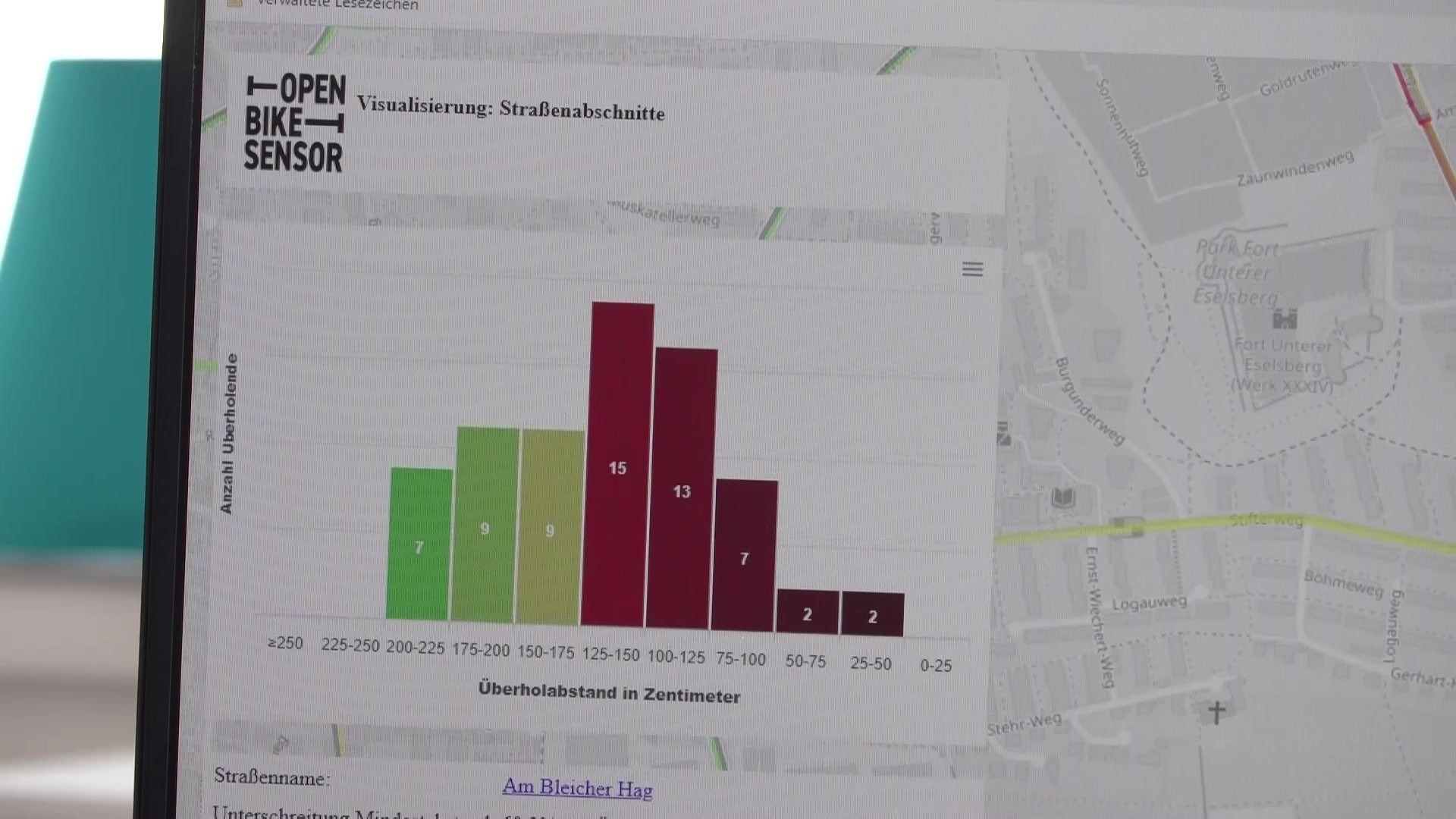 Fünf Sekunden rückwirkend zeichnet das Gerät den Abstand zum überholenden Auto auf. Alle Messwerte werden letztlich in einer Karte aufbereitet. Grüne Stellen sind für Fahrradfahrer unbedenklich. Hier wird der innerorts vorgeschriebene Abstand von 1,50m eingehalten. An den Roten Stellen besteht verbesserungsbedarf.