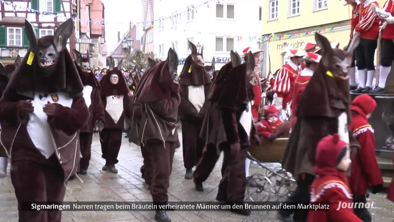 In jeder Stadt gibt es zur Fasnet eigene Bräuche und Gepflogenheiten. In Sigmaringen schaut man auf eine jahrhundertealte Tradition zurück: Jedes Jahr am Fasnetsdienstag werden frischverheiratete Männer oder Männer, die ein Ehejubiläum feiern, auf einer Stange um den Brunnen auf dem Marktplatz getragen. Dieses Jahr drehte auch der Bundestagsabgeordnete Thomas Bareiß beim sogenannten Bräuteln seine Runden.