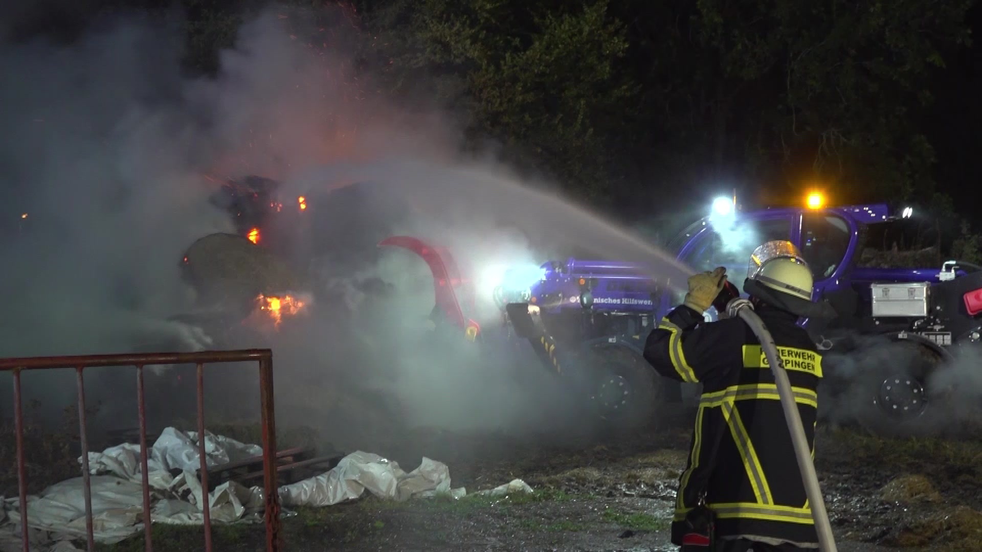 Am Samstagabend haben rund 20 Heuballen auf einem weitläufigen Gartengrundstück zwischen der B10 und der Klinik am Eichert in Göppingen gebrannt. Die Feuerwehr Göppingen war schnell mit einem Großaufgebot vor Ort und begann mit den Löscharbeiten. Dabei kam es zu einer starken Rauchentwicklung – die Anwohner wurden über Warn-Apps gebeten Fenster und Türen zu schließen. Die Feuerwehr beendete die Löscharbeiten gegen 3 Uhr. Verletzt wurde niemand. Der Sachschaden beläuft sich auf etwa 10.000 Euro. Die Brandursache ist derzeit noch unklar.