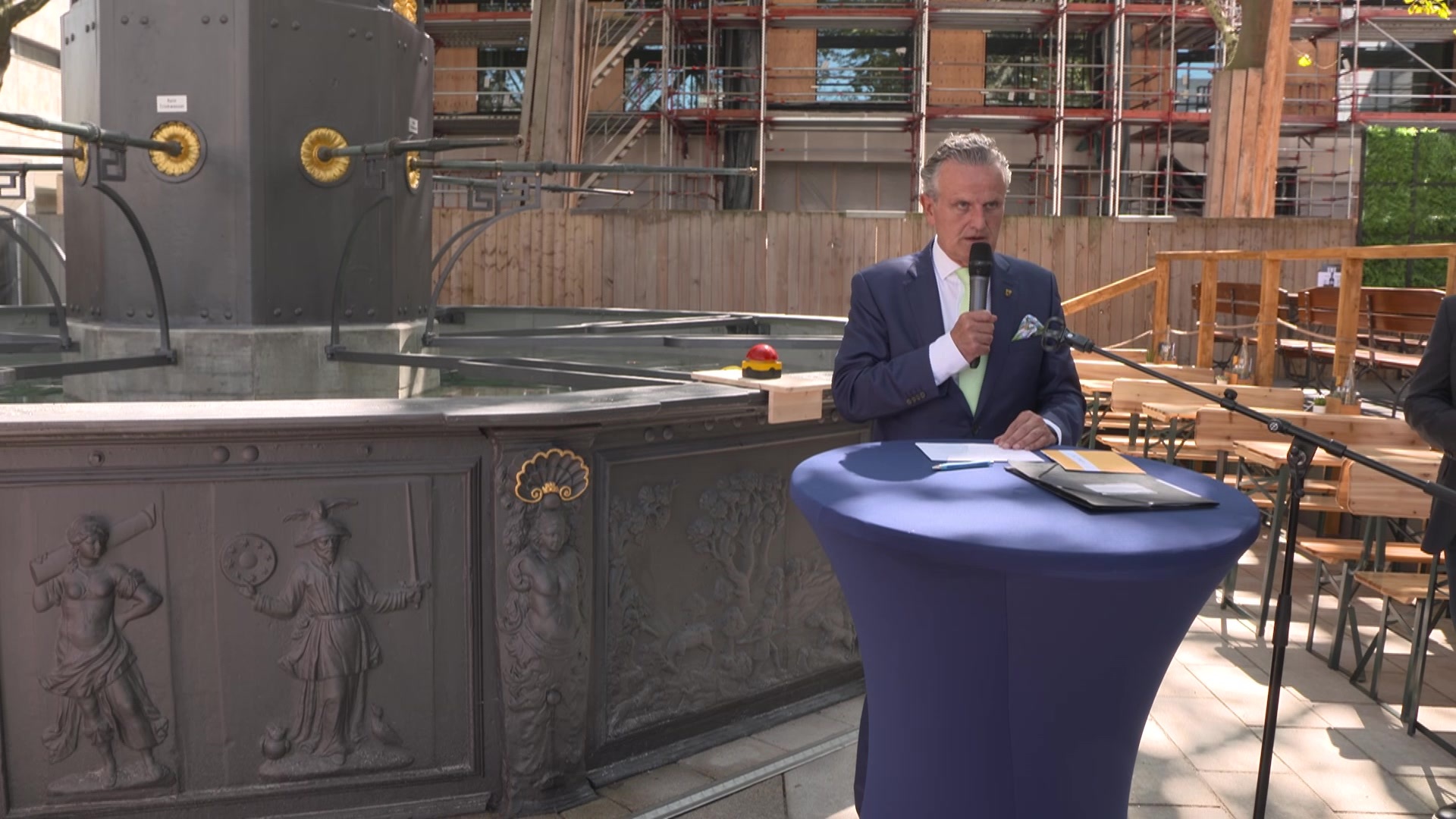 Es plätschert wieder auf dem Rathausplatz: Heute Mittag wurde der Stuttgarter Marktbrunnen von OB Frank Nopper feierlich wieder eröffnet. Eigentlich sollten die Sanierungsabreiten bereits im vergangenen Jahr abgeschlossen werden. Da der Brunnen aus dem Jahr 1714 unter Denkmalschutz steht, waren die Sanierungsarbeiten aber sehr aufwendig. Aus diesem Grund konnte in der ersten Ausschreibungsrunde auch kein Bieter gefunden werden. Die anschließend beauftragte Fachfirma konnte die Arbeiten jedoch nun fertig stellen und so hat Stuttgart wieder eine Wasserstelle mehr.