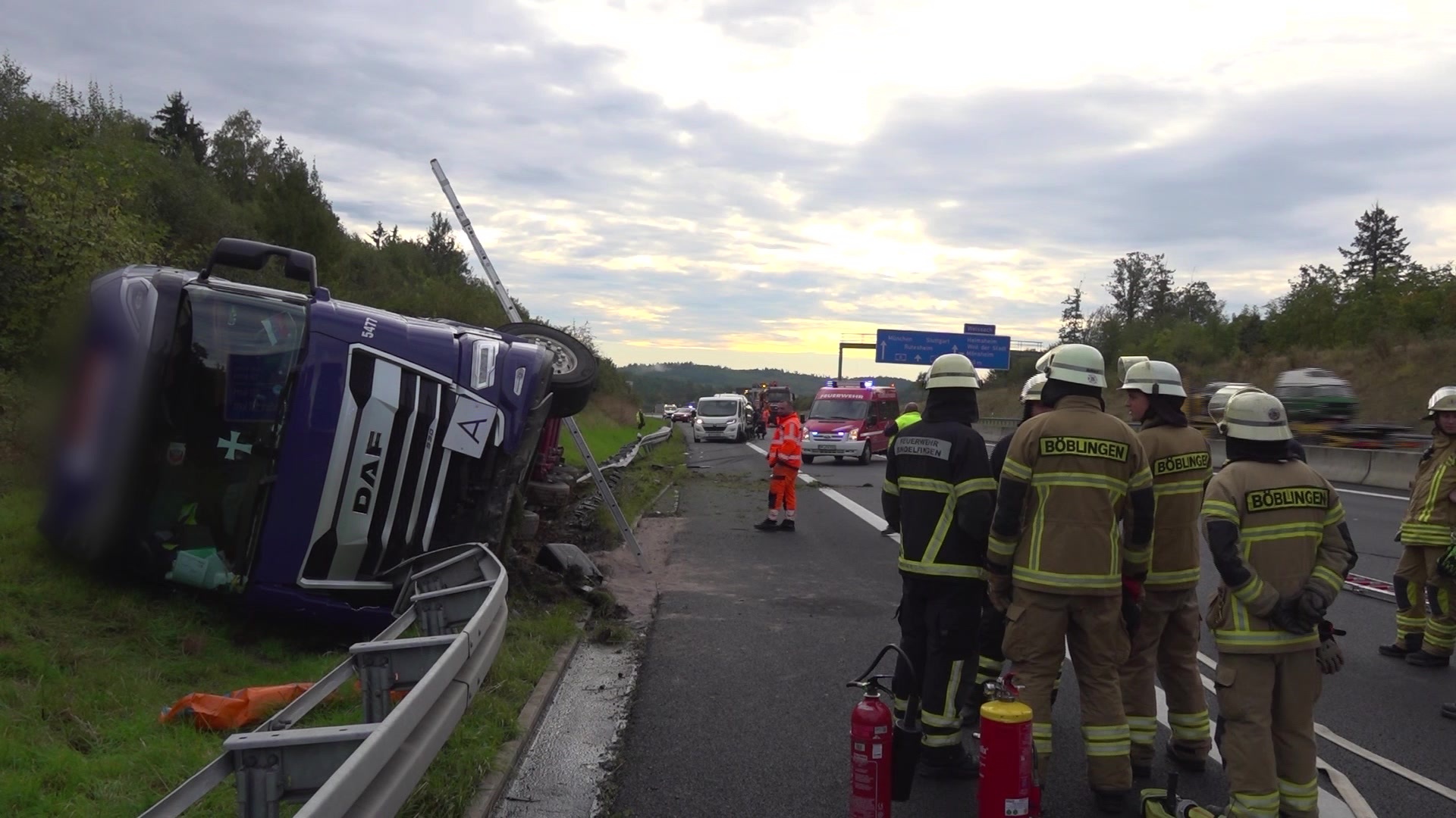 Ein umgekippter Tanklaster hat dafür gesorgt, dass die Autobahn A8 bei Heimsheim am Mittwoch für mehrere Stunden gesperrt werden musste. Der 61-jährige Tanklastwagen-Fahrer war gegen 08:45 Uhr auf der Autobahn in Richtung Karlsruhe auf der rechten Fahrspur unterwegs. Nach derzeitigem Ermittlungstand hatte ein vor ihm fahrender Kleintransporter mit einem Pkw-beladenen Anhänger nach der Anschlussstelle Heimsheim eine Reifenpanne. Der Fahrer vom Sattelzug wich daraufhin auf die Mittelspur aus. Bei dem Ausweichmanöver streifte er den Kleintransporter, kam nach rechts von der Fahrbahn ab und kippte um. Ernsthafte verletzt wurde bei dem Unfall niemand. Den Schaden schätzt die Polizei auf etwa 250 000 Euro.